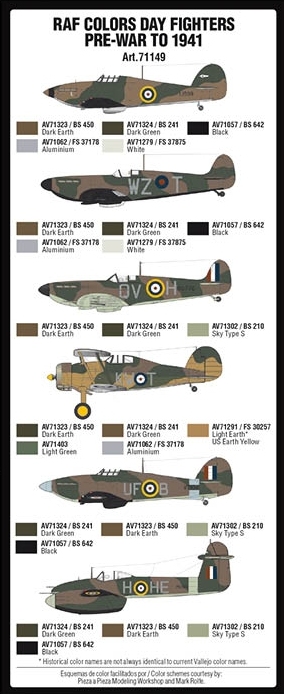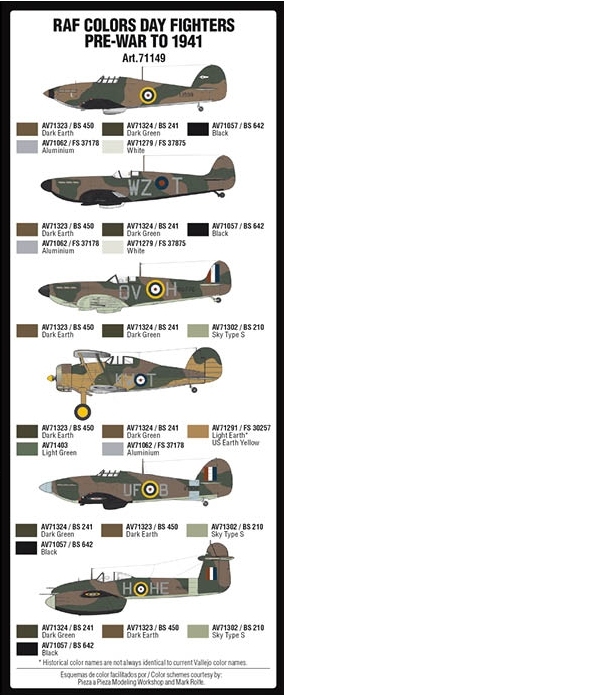 Set of Model Air colors. developed for painting the RAF fighter camouflage scheme “Temperate Land” in its different color combinations from the years before WWII (starting in 1937) and the beginning of the conflict in 1939, with the first battles in Norway, Netherland, France and England, until August 1941. The set also includes the colors for the “Shadow Compensation” color scheme used in biplanes of all models and deployment.