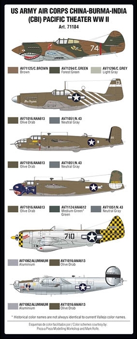 Set with Model Air colors developed for painting the camouflage patterns of most of the aircraft of the US ARMY AIR CORPS deployed in the China/Burma/India (CBI) Theater of Operations, as well as in the Pacific Campaign during WWII.