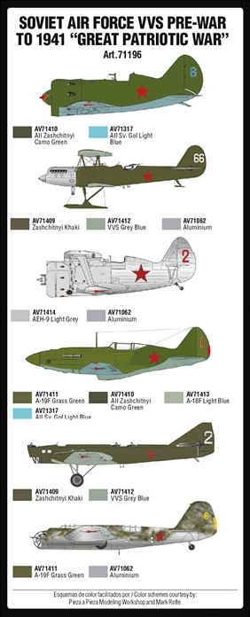 Set with Model Air colors developed for painting the various color combinations of the camouflage color schemes of the Soviet aircraft, starting with the years prior to WWII (the thirties) until the URSS entered “The Great Patriotic War” in June 1941.